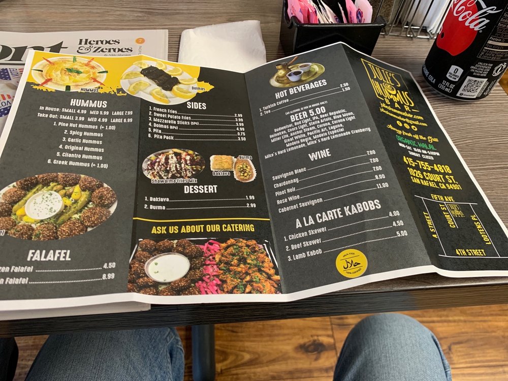 - Sides: Complement your meal with crispy sweet potato fries or the iconic hummus served with fresh pita chips.